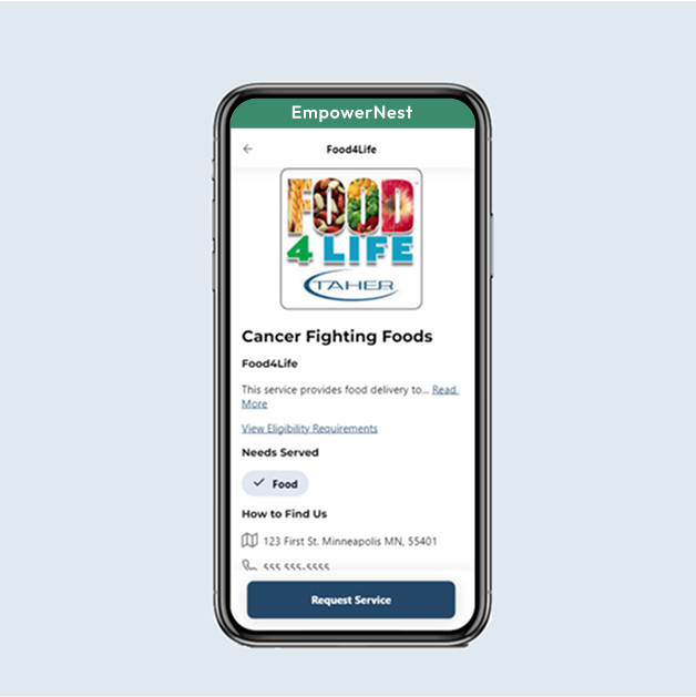 EmpowerNest helps people self-identify non-medical needs and choose a local community-based organization (CBO) that fits eligibility and preferences. Content is written with plain-language descriptions and links to requirements (hours, languages, service areas). Patients pick the CBO, share data by consent, and can confirm when a service is received; partners then acknowledge within 48 hours and keep status current.